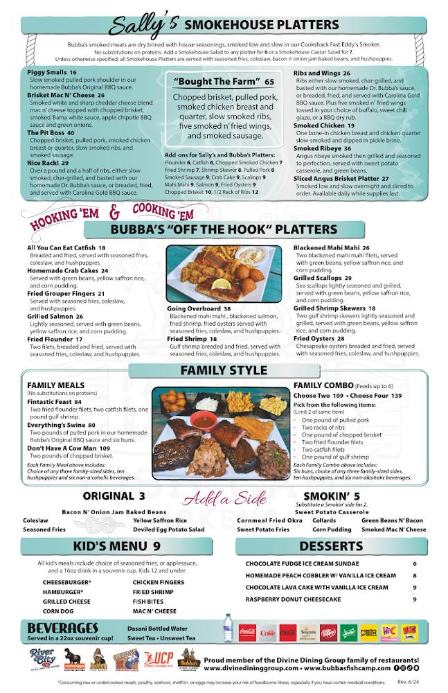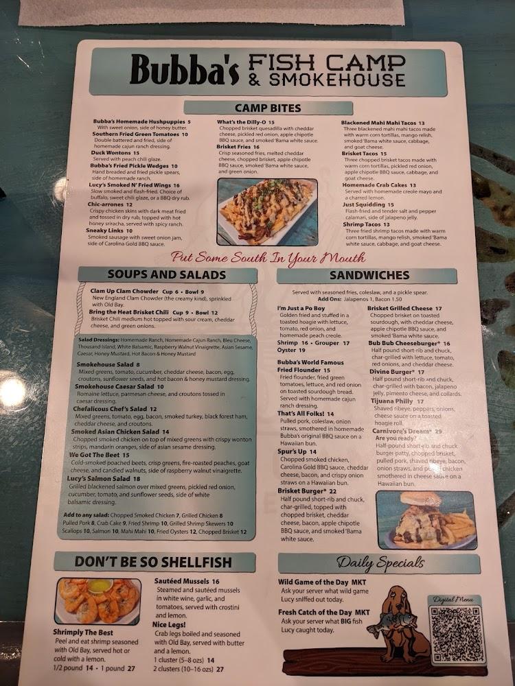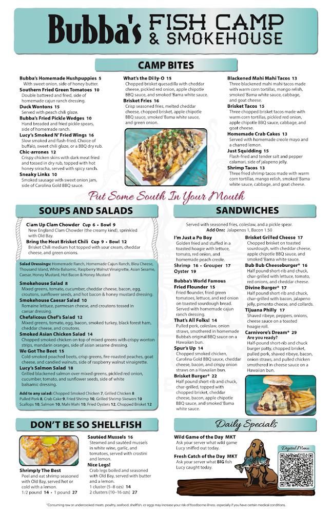 Bubba's Fish Camp & Smokehouse offers a diverse menu curated for all tastes. From in-house smoked meats to fresh seafood, choices abound. Signature dishes include rib plates, homemade hushpuppies, and family-style feasts ideal for sharing. The menu showcases traditional Southern flavors alongside fresh local ingredients. Diners can enjoy exciting appetizers, hearty sandwiches, and delightful desserts like chocolate fudge ice cream sundaes. Unique options like 'All You Can Eat Catfish' add to the appeal. Prices range from $20 to $30 for signature meals, making it budget-friendly.